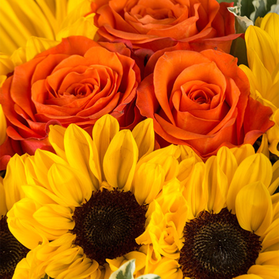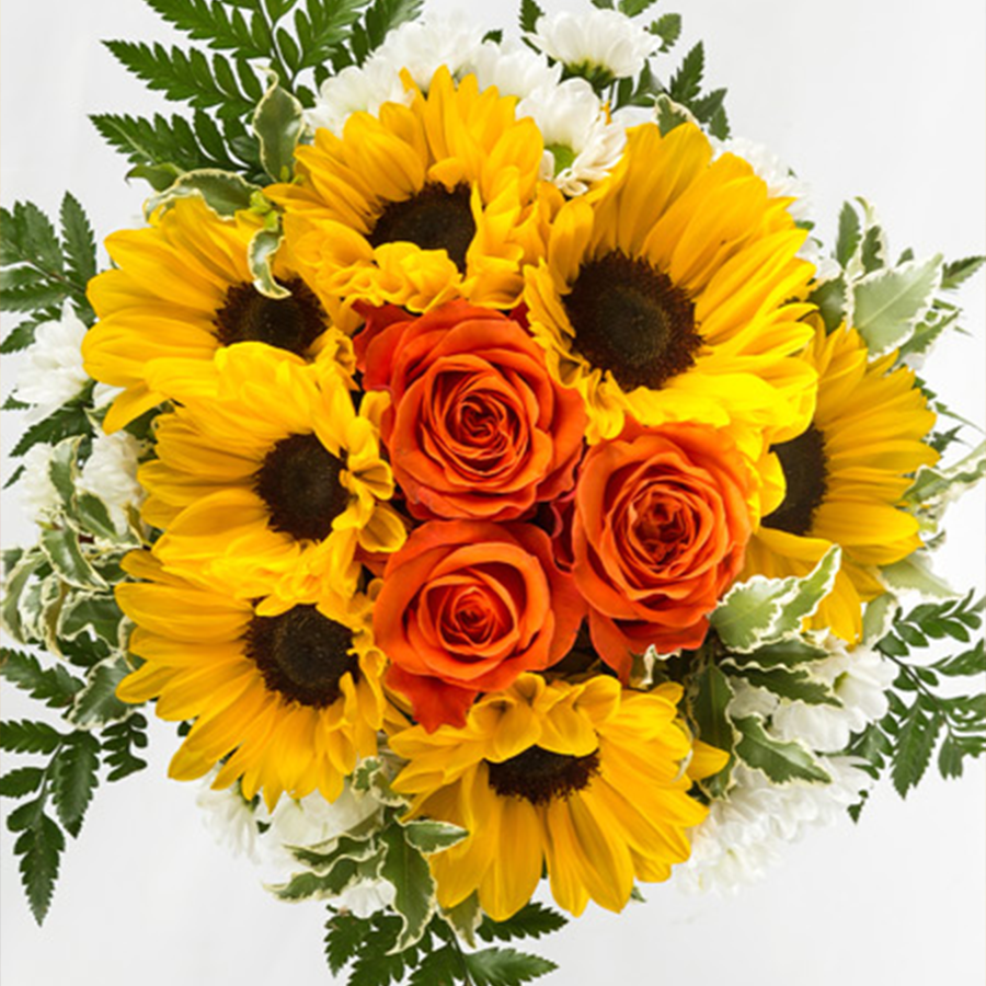 Bellissimo bouquet con girasoli, rose arancio e santini bianchi. Ideale da regalare per qualsiasi occasione estiva.