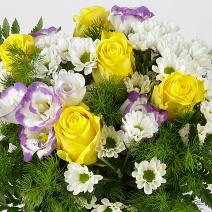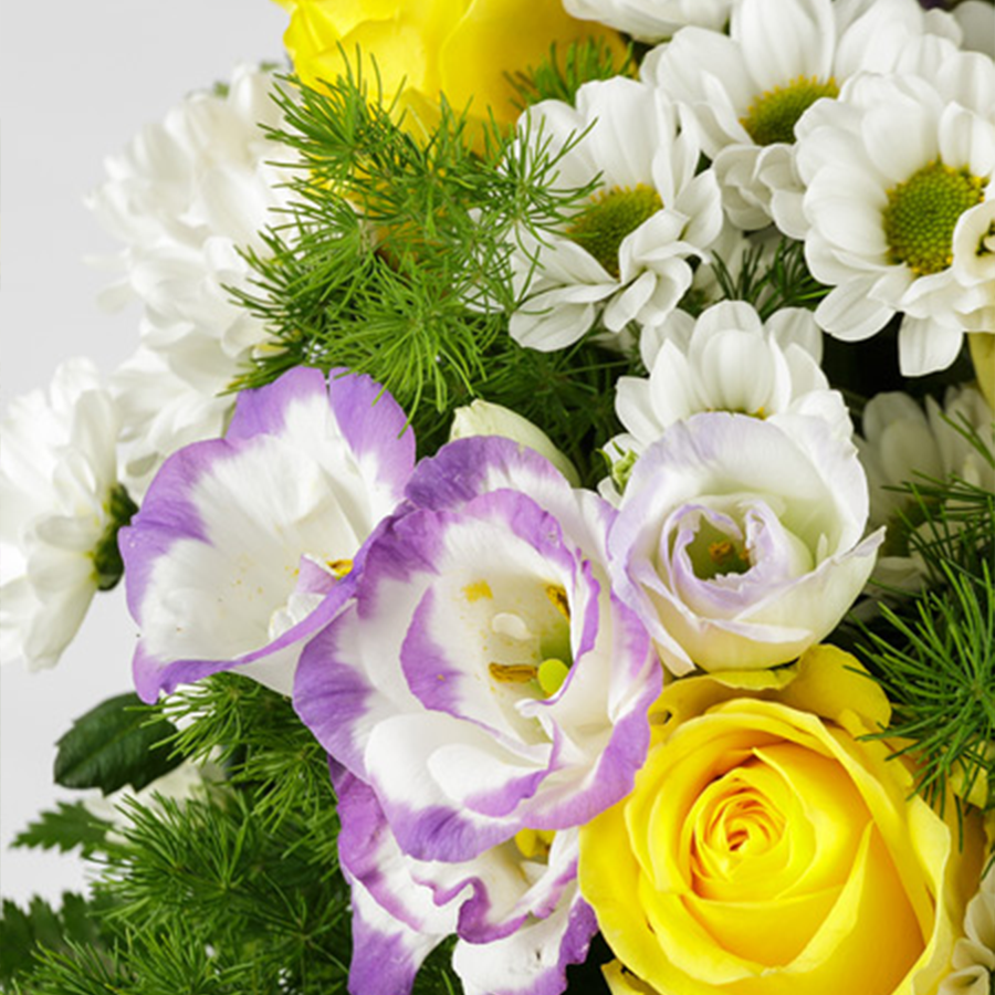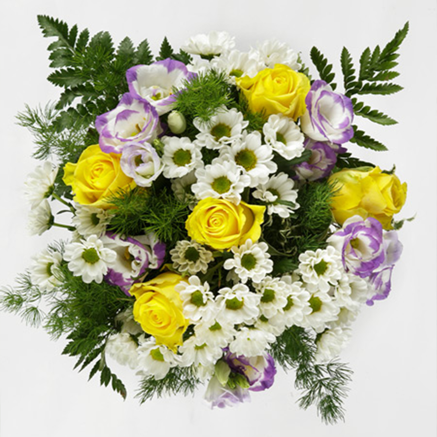Bouquet solare con rose gialle e lisianthus viola. Ideale per qualsiasi occasione, anniversari, ringraziamenti o semplicemente per augurare una splendida giornata. La creazione verrà consegnata a mano dal fiorista personalmente al destinatario.